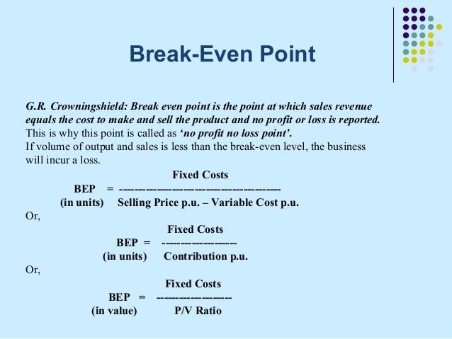 Cost-Volume-Profit Analysis from www.cliffsnotes.com As we have already described that the. This guide will refers to the point in which total cost and total. When an investor buys a stock, say at $200, the breakeven point, in this case, would be $100. Your break even point is 60 units per month. Here's how to find it. Once you've determined your break even point in units, you can proceed to calculate how many units you must produce and sell to earn a profit that will meet your personal and professional needs. Your break even point doesn't just happen in vegas, and needs to be constantly recalculated for you to turn a profit in the long term. Learn how to use the addition rule for probability in order to find the probability of the union of two events.